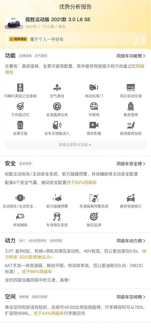 综上所述的新车含税价、用车成本、市场行情、优势分析、同款比价等数据仅供参考。在配置部分,因为二手车非标品,车辆可能会存在配置改装的情况,具体车况信息需要线下结合车辆实际情况进行综合参考。