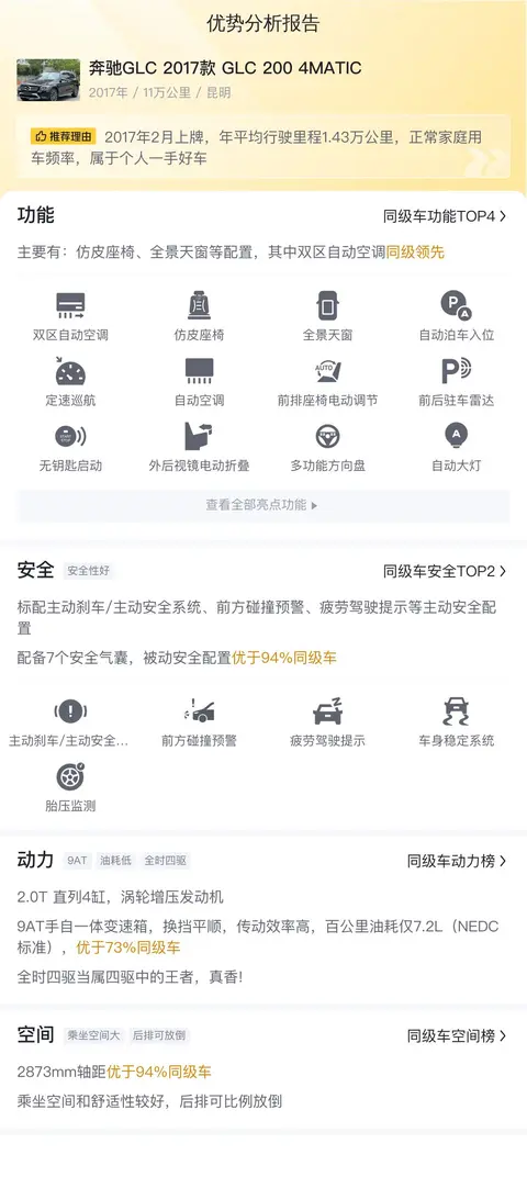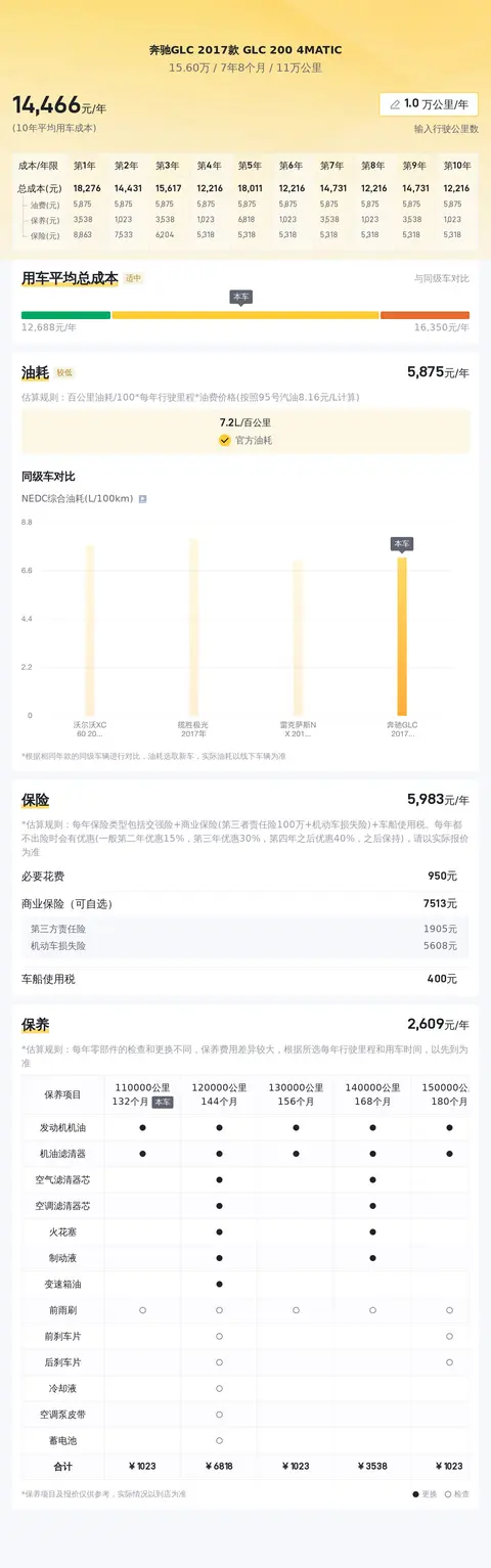 同时根据估算,同级车的最低用车成本是13178元/年,最高是18346元/年,奔驰GLC 2017款 GLC 200 4MATIC是14188元/年,用车成本适中,但偏高。