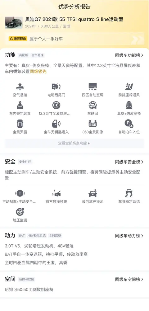 在用车成本方面,根据懂车帝平台的估算,这款奥迪Q7 2021款 55 TFSI quattro S line冰雪运动型的10年平均用车成本大约在23185元/年,这个用车成本包含燃油费、保养费及保险费,具体金额根据用车强度及行驶里程而定。在不考虑其他费用大幅波动的情况下,您可以结合自己当地的实际情况大致计算用车成本。