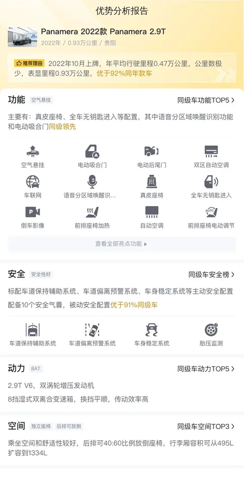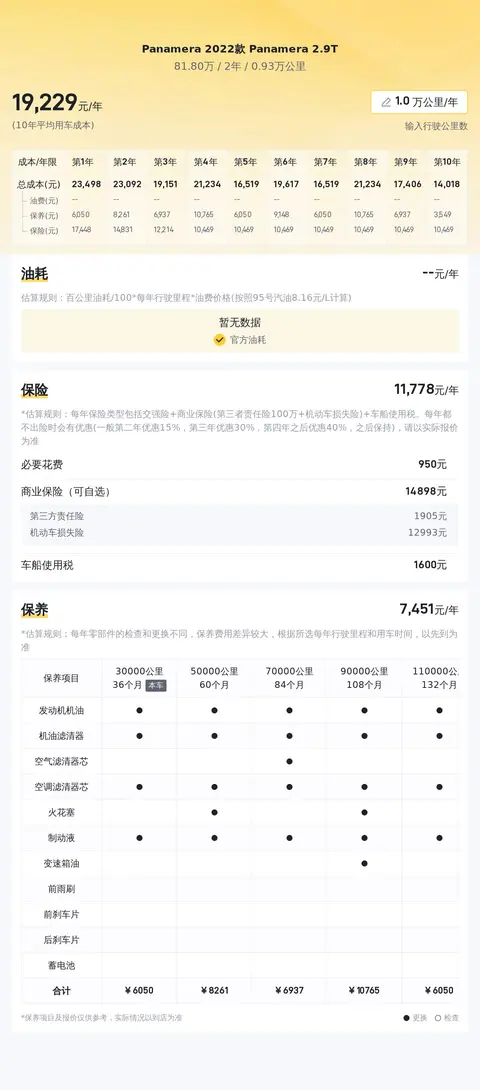 保时捷Panamera 2022款 Panamera 2.9T的市场行情价为73.24万-86.29万,本车报价81.80万,预计再行驶2年后,还能卖61万,保值率挺高的。10年平均用车成本为21188元/年,其中平均油耗成本为11130元/年,平均保险费用为8885元/年,其他养护成本为1173元/年。对于这样一辆豪华车来说,这样的用车成本还是比较合理的。