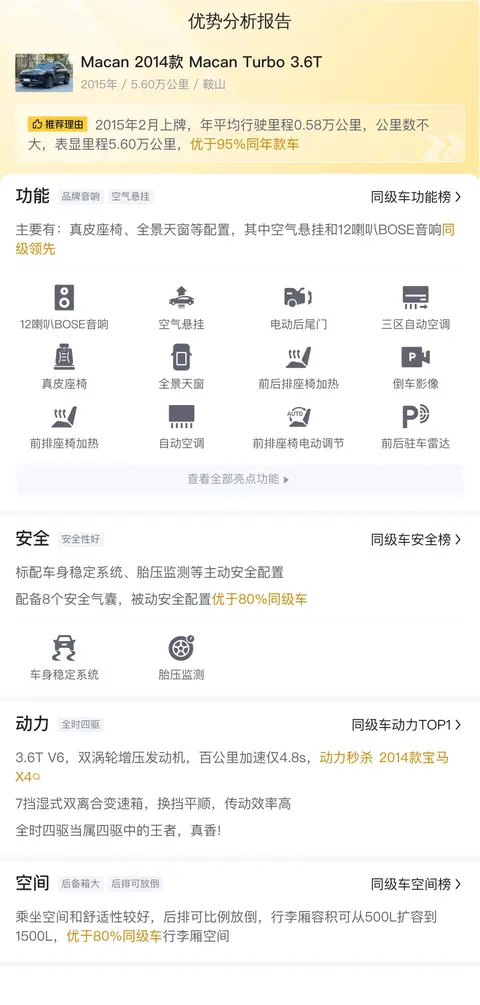 这辆Macan 2014款 Macan Turbo 3.6T因为基础版车型的高阶版本,Turbo版本动力表现优秀,而且保时捷的品牌溢价能力不是一般的好,所以价格并不太美丽,参考同款车型二手在售的价格为20.77万至25.86万,但这辆Macan 2014款 Macan Turbo 3.6T的二手报价为31.80万,报价过高劝退了不少想买进的车友,不过喜欢的人自然会为其付费~