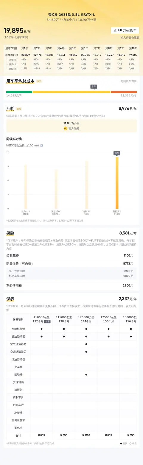 据估算,同级车的最低用车成本是17038元/年,最高是23776元/年,普拉多 2018款 3.5L 自动TX-L是20055元/年,整体不算低,但也合理。