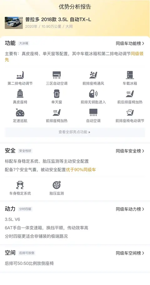 优势:普拉多 2018款 3.5L 自动TX-L的市场行情价是32.75万-40.12万,它的报价则是34.80万,价格适中而且保值率高。加上这车西部地区保有量极高,售后保障无忧,玩越野的车友圈子里普拉多也是明星车型,连带着配件改装车也非常丰富,后期改装升级都方便。