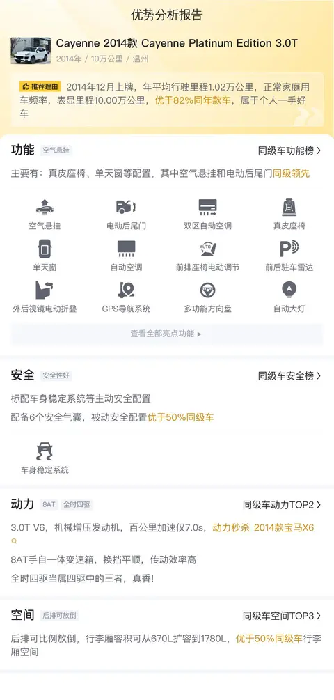 总结:Cayenne 2014款 Cayenne Platinum Edition 3.0T作为一款集豪华与性能于一身的SUV,凭借其卓越的动力表现、宽敞舒适的乘坐空间以及丰富的配置,在二手车市场上备受瞩目。尽管长期使用可能会带来一定的用车成本,但考虑到其豪华品牌属性及出色的保值能力,对于追求高品质驾乘体验的消费者而言,Cayenne 2014款 Cayenne Platinum Edition 3.0T依旧是一款值得考虑的车型。需要注意的是,车辆的实际状况才是决定其价值的关键因素。