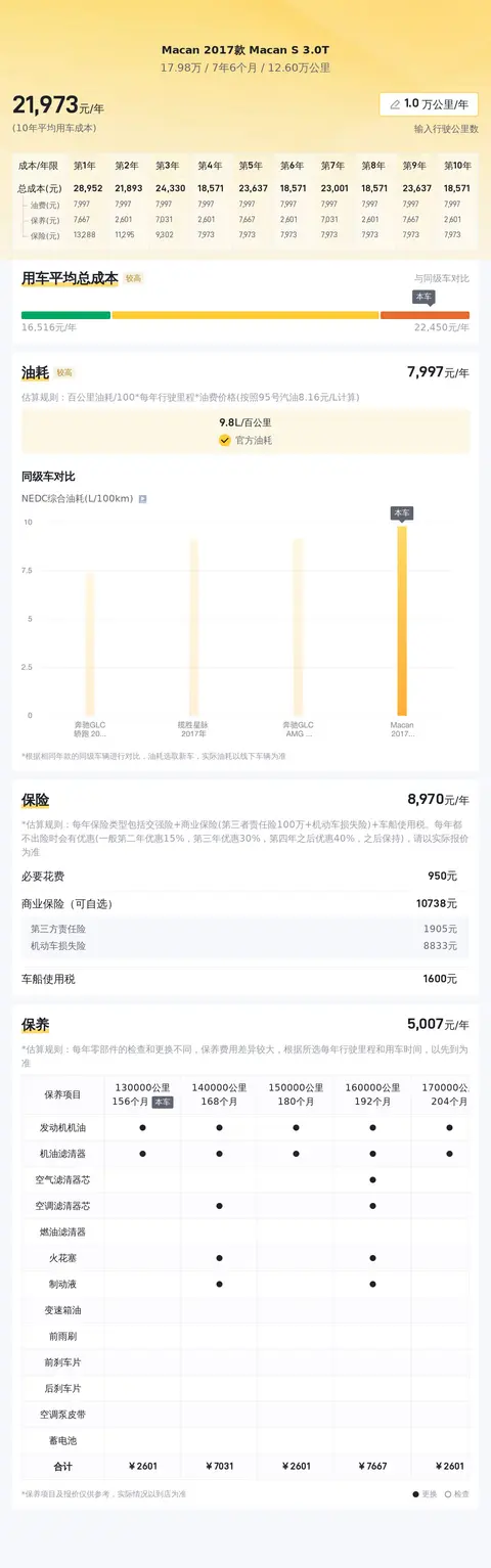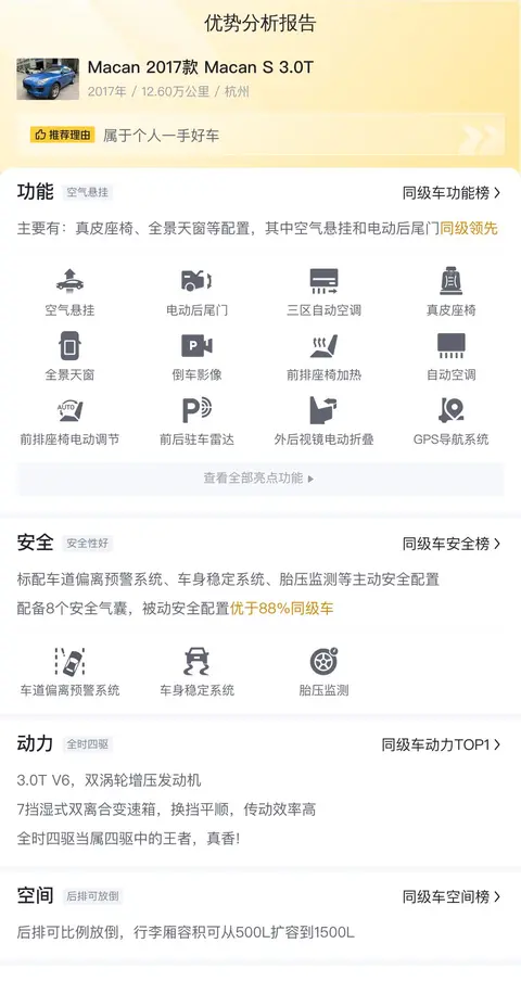 缺点:17年上牌的车,车龄略高,行驶里程也有12万公里,后期维修保养时,可能需要特别留意相关问题。该车动力强,排量大,油耗这块可能就不太友好,燃油经济性较差,日常用车开支较大。车主反映Macan的后排空间较为狭小,乘坐起来可能不够舒适,尤其是对于身材较高大的乘客。