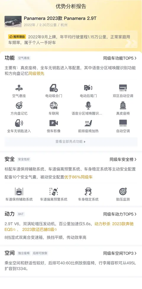 二手Panamera 2023款 Panamera 2.9T的价格虽然高于市场行情,但车况好的也比较明显。不到两年车龄,行驶里程也不多,性能状态都处于比较好的状态,外观没有剐蹭损伤,内饰没有污损老化,功能没有故障失效。这么看来,报价高也有高的道理,就看消费者是否认可了。