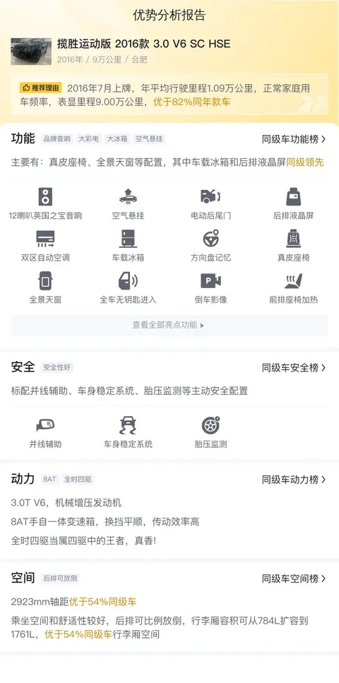 市场行情方面,根据懂车帝的数据,揽胜运动版2016款3.0 V6 SC HSE的二手车价格区间为32.25万元至39.73万元。然而,考虑到这款车已经行驶了9万公里且有过一次过户,其售价仅为25.98万元,相比市场行情具有较高的性价比。用车成本方面,这款车的官方百公里油耗为10.7升,按照每年行驶2万公里计算,每年的油费约为1.7万元。加上保险费用和保养费用,预计每年的用车成本约为2.6万元。虽然该车没有检测报告,但我们可以通过文中介绍的各方面情况来评估这辆车的综合状况。总体而言,这款车在动力、舒适性和安全性方面都表现出色,是一款性价比较高的二手豪华SUV。如果对您感兴趣可以去现场感受一下。
