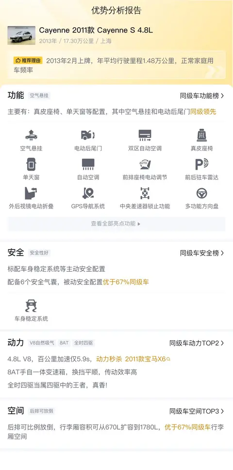 综上所述的用车成本、市场行情、优势分析、同款比价等数据仅供参考,车况信息需要线下结合车辆实际情况进行综合参考。这辆Cayenne 2011款 Cayenne S 4.8L虽然价格下探了不少,但毕竟上牌时间比较长,加上多次过户,购买还需谨慎。