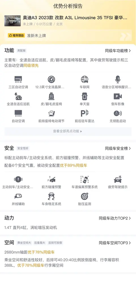 对于那些追求时尚、品质和性价比的消费者来说,这辆未上牌的奥迪A3 2023款改款A3L Limousine 35 TFSI豪华运动型无疑是一个不错的选择。首先,作为一款全新的二手车,它的车况几乎与全新车无异,这在一定程度上降低了消费者的购车成本。其次,奥迪A3 2023款改款A3L Limousine 35 TFSI豪华运动型在配置、性能和舒适性等方面都有着不错的表现,能够满足大多数消费者的日常需求。然而,作为一款紧凑型轿车,奥迪A3 2023款改款A3L Limousine 35 TFSI豪华运动型也存在一些不足之处。例如,车内空间可能无法与同级别SUV相媲美;部分配置如电动后尾门、全景天窗等并未配备,可能会让一些追求高科技配置的消费者感到稍有遗憾。但总体而言,这辆未上牌的奥迪A3 2023款改款A3L Limousine 35 TFSI豪华运动型依旧是一款值得推荐的二手车。
