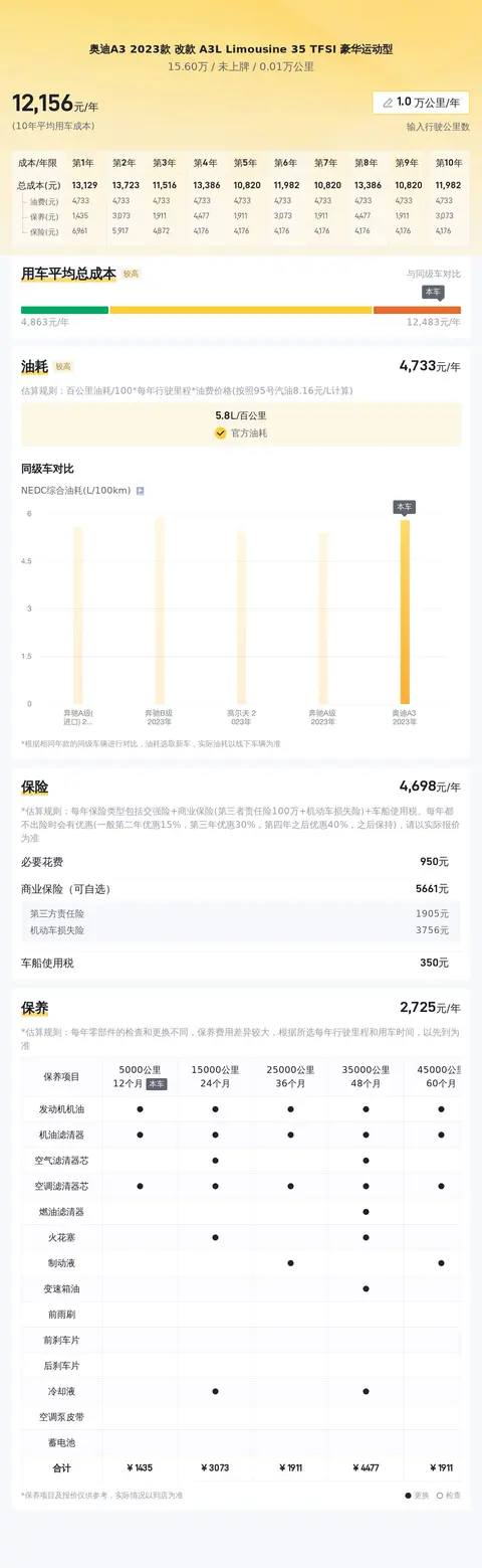 在不考虑贷款利息的情况下,这辆未上牌的奥迪A3 2023款改款A3L Limousine 35 TFSI豪华运动型的用车成本主要包括保险费用和保养费用两部分。根据预估,该车的保险费用大约为5102元/年,这一费用涵盖了基本的车损险、第三者责任险(100万)以及交强险。至于保养费用方面,由于该车还未曾进行过保养,因此这一部分的费用暂时无需考虑。但根据奥迪A3 2023款改款A3L Limousine 35 TFSI豪华运动型的保养周期和项目来看,其保养费用应该会在一个合理的范围内。需要指出的是,用车成本中的油费和停车费因人而异,这一部分的费用并未纳入上述计算之中。总的来说,这辆未上牌的奥迪A3 2023款改款A3L Limousine 35 TFSI豪华运动型的用车成本相对较为合理。但为了确保行车安全和车辆性能的稳定,建议车主在日常使用过程中还是要定期进行保养和维护。