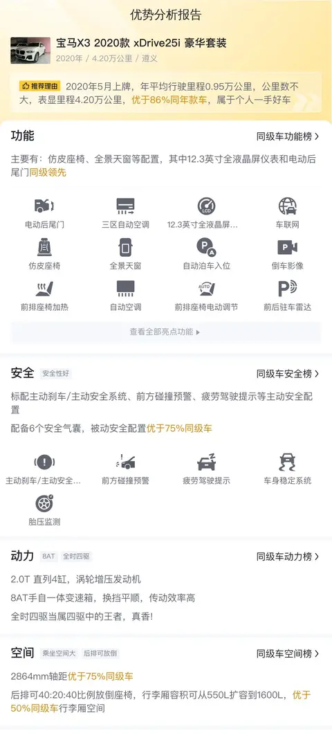 该车作为一款中型SUV,2020年5月在遵义上牌,行驶里程4.2万公里,北京牌照,0过户。动力方面,搭载2.0T发动机,匹配8AT变速箱,四轮驱动,工信部综合油耗7.9L/100km。内饰采用深色设计,外观为白色,漆面如新,外观与内饰均保持得相当好。原价42.58万元,现优惠至22.58万元,节省高达20万元,是新车的半价。