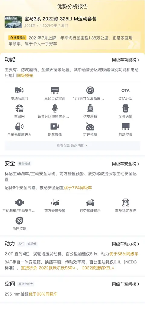 另外,这辆宝马3系 2022款 325Li M运动套装的市场行情价是21.06万-26.17万,它的报价则是21.80万,报价偏低,值得考虑,不过和同级车相比,它的保值率并不高,同级车的最高保值率为57.09%,而它的则是52.77%。
