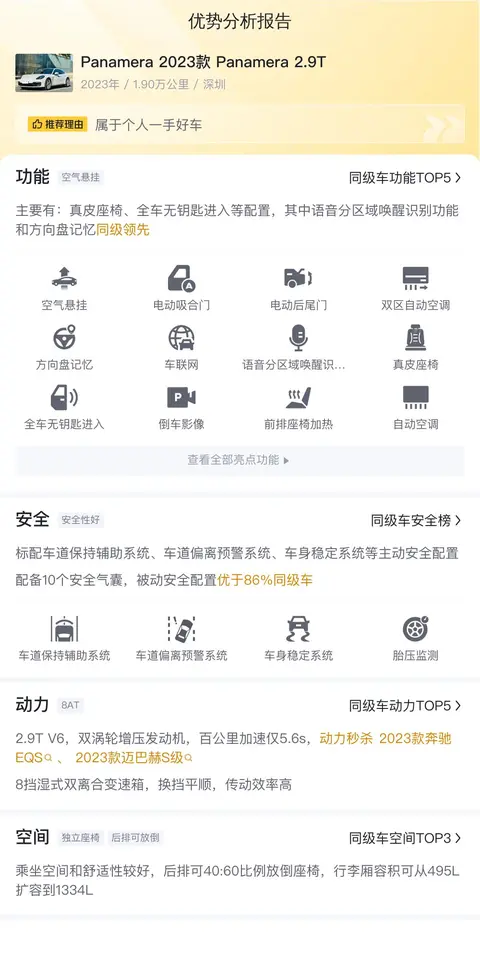 综合来看,这辆保时捷Panamera 2023款 Panamera 2.9T还是一辆非常不错的车型,准新准新的车况,动力方面又能做到推背感强烈,保时捷的牌子又足够响亮,唯一需要考虑的,无非是养车费用较高,以及价格方面的性价比一般,但换个角度想,坐进车里,感受到超跑般的座椅包裹感,看到右车门板上,电动座椅调节的一排按键,别问我按一排按键是什么体验,问就是爽!值不值,只有兄弟们自己心里有数了!