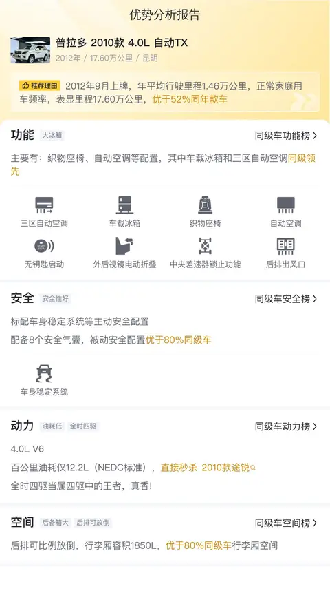 报价相对较高,普拉多 2010款 4.0L 自动TX的市场行情价是19.15万-24.72万,它的报价是24.30万,价格上不占什么优势,但保值率较高。