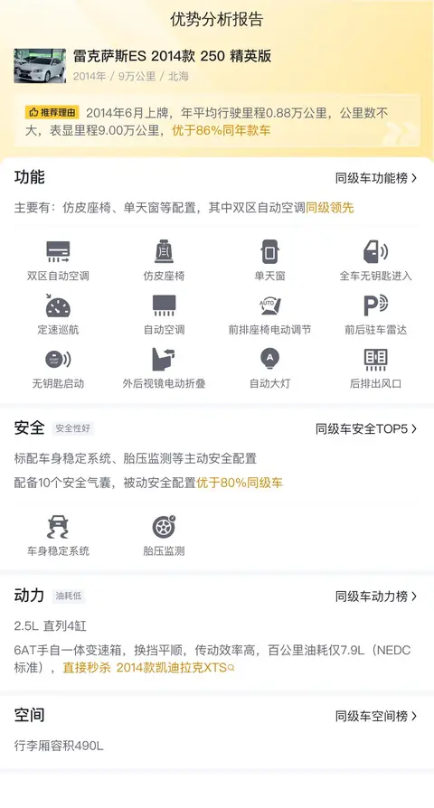 据估算,同级车的最低用车成本是13555元/年,最高是17340元/年,雷克萨斯ES 2014款 250 精英版是14130元/年,用车成本适中。