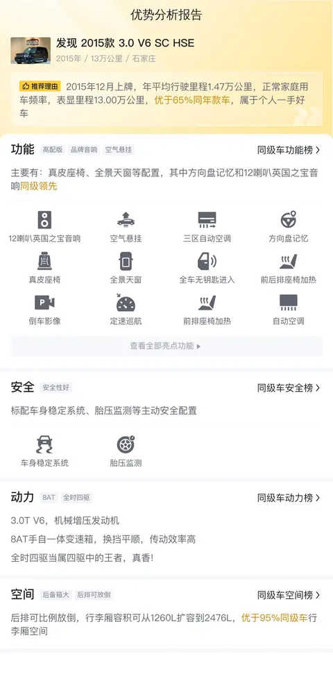 发现 2015款 3.0 V6 SC HSE,属于中大型SUV,车身颜色为黑色,上牌地是石家庄,表显里程13万公里,上牌日期2015年12月,新车含税价91.97万,这台二手车报价23.98万,过户次数为0次。