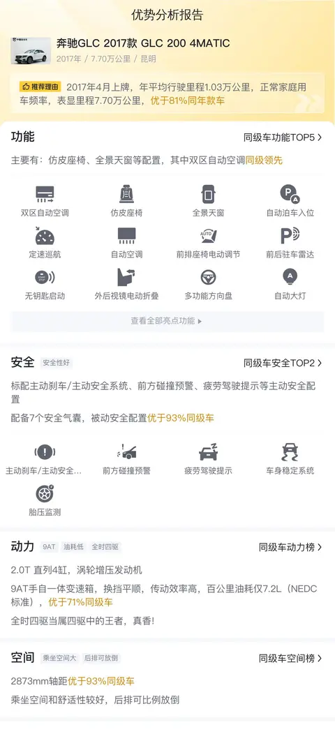 据估算,同级车的最低用车成本是13598元/年,最高是18798元/年,奔驰GLC 2017款 GLC 200 4MATIC是14180元/年,用车成本不算低。