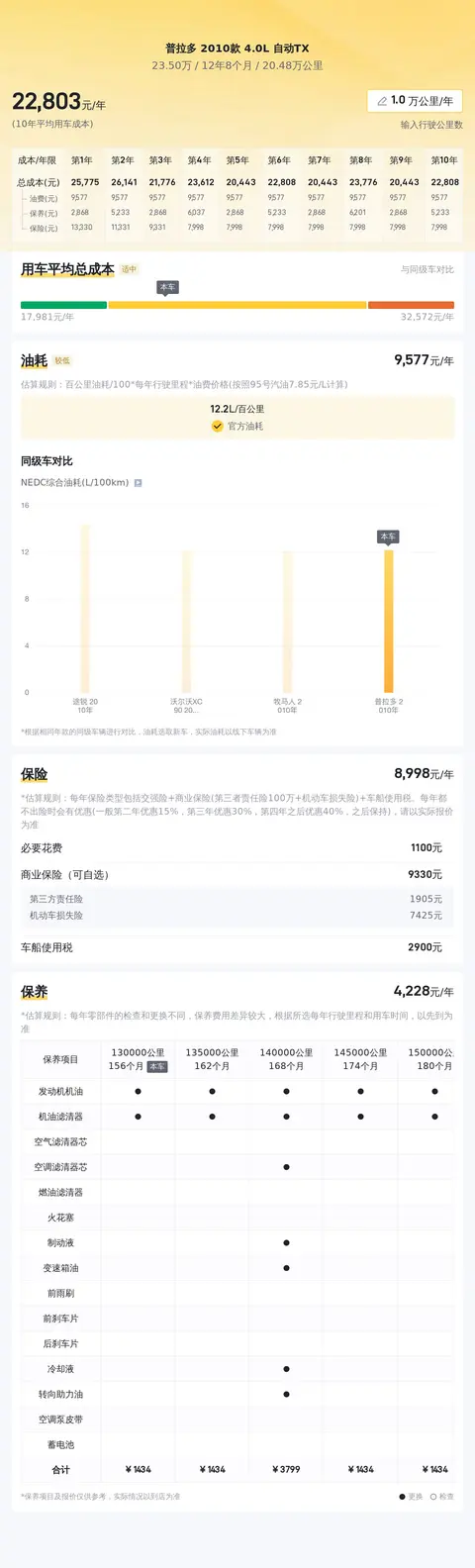 据估算,普拉多 2010款 4.0L 自动TX的用车成本也高,因为同级车的最低用车成本是15118元/年,最高是27784元/年,而普拉多 2010款 4.0L 自动TX是23278元/年。