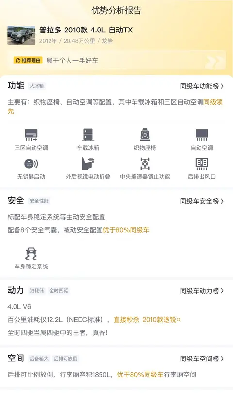 优势:普拉多名气大,保值率高,开着省心,不会有小毛病,这款普拉多 2010款 4.0L 自动TX的使用程度也可以,配置方面比较丰富,冰箱、无钥匙启动都有,安全性也很好,配置了8个安全气囊,同级领先。加上普拉多的通过性很好,可以越野,可以走很多别的车不敢走的路,买它,就是买了放心和安心。
