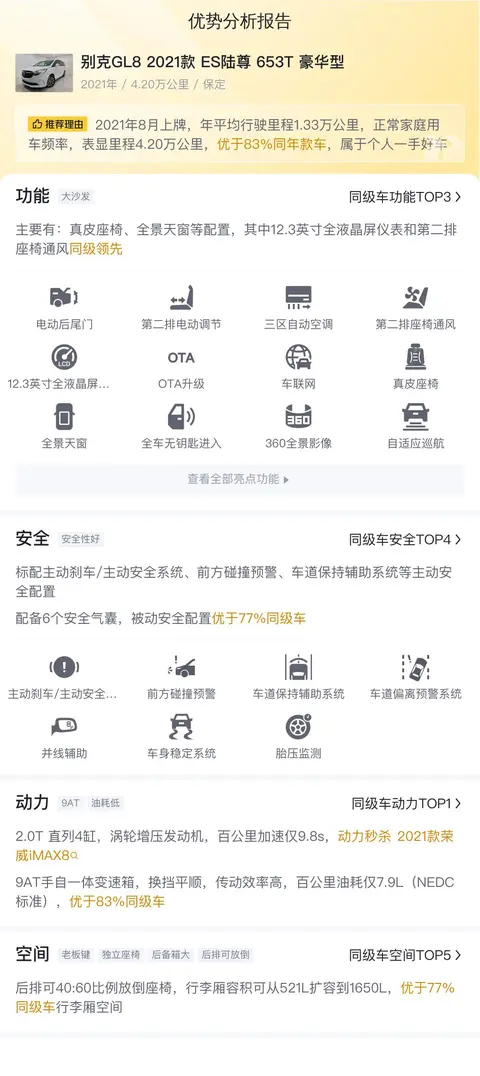 优势:作为早期MPV的代表,别克GL8的知名度尚可,保值率有一定保障。空间大,适合全家出行。配置丰富,第二排的舒适度很高,适合商务接待。车子行驶里程较少,保养不错。价格相比新车优惠力度大。