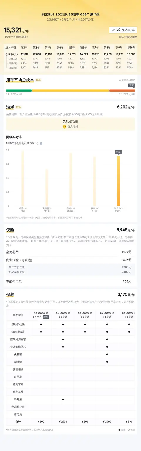 据估算,同级车的最低用车成本是14388元/年,最高是16270元/年,别克GL8 2021款 ES陆尊 653T 豪华型是15371元/年,所以不算低。