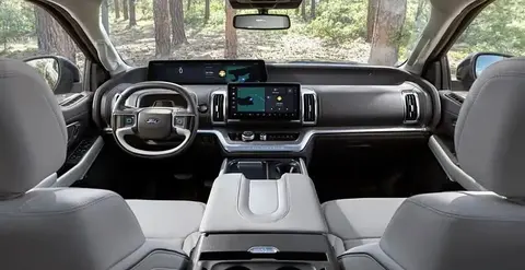 从外观上看,全新福特Expedition采用了最新的设计语言,双层前大灯组独具美式风情,与中网融合,贯穿相连,日行灯勾勒出中网的轮廓线,视觉效果不错。车身的B柱、C柱、D柱都采用了熏黑处理,尾门上的大面积黑色装饰与车身整体风格相呼应,尾部则配备了竖置尾灯,整体来看有着不俗的空间实用性,后悬部分较长。值得一提的是,尾门设计独特,可以分层开启,方便用户坐在下尾门板上休息或取物。