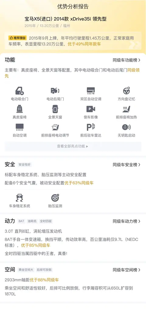 今天我们要看的这款宝马X5(进口) 2014款 xDrive35i 领先型上牌地为福建福州,上牌日期2015年9月,表显里程13.2万公里,新车指导价91.8万,二手车报价16.98万,过户次数1次。