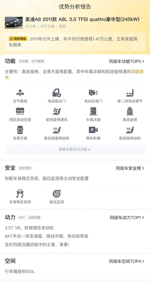 市场行情也是买家关注的重点之一。目前这款奥迪A8的二手车行情大致在9.21万至11.93万之间。用车成本也是每个车主必须考虑的实际情况。根据估算,这辆A8的年均综合用车成本在2.9万元左右。