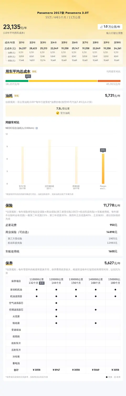 另外,同级车的最低10年平均用车成本是18793元/年,最高是46725元/年,保时捷Panamera的则是23197元/年,适中的水准,不占优势。