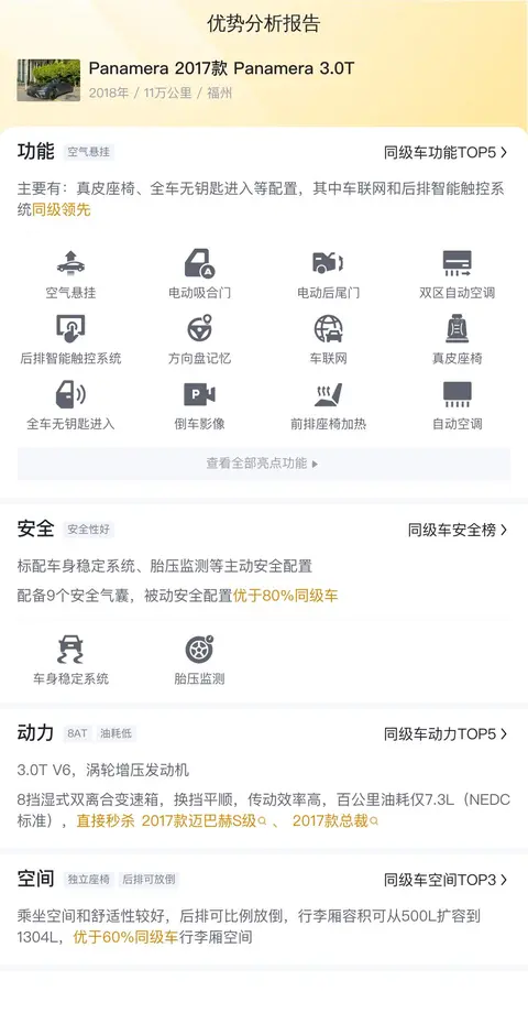 二手车的配置也很重要,这辆保时捷Panamera配备了真皮座椅、第二排电动调节、前排座椅加热、前后排座椅加热等配置,其中第二排电动调节同级领先。安全配置上,标配车道偏离预警系统、车身稳定系统、胎压监测等主动安全配置,配备7个安全气囊,被动安全配置优于75%同级车。