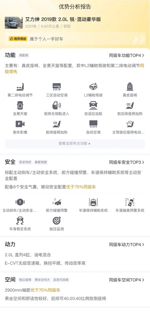 总结:艾力绅 2019款 2.0L 锐·混动豪华版二手车是一款集豪华、舒适与实用于一身的车型。它拥有宽敞的空间、舒适的座椅以及丰富的配置,为乘客提供了极致的乘坐体验。同时,车辆搭载的油电混合动力系统不仅降低了油耗,还减少了尾气排放,展现了环保与节能的双重优势。作为一款二手车,艾力绅 2019款 2.0L 锐·混动豪华版在市场中保持着良好的口碑和较高的保值率。它见证了无数家庭的欢乐时光,也承载了无数商务人士的成功梦想。选择艾力绅,就是选择了一种高品质的生活方式和一种对未来的 responsible attitude(负责任的态度)。无论您是想购买一辆家庭用车还是商务接待车,艾力绅 2019款 2.0L 锐·混动豪华版都是一个不容错过的选择。