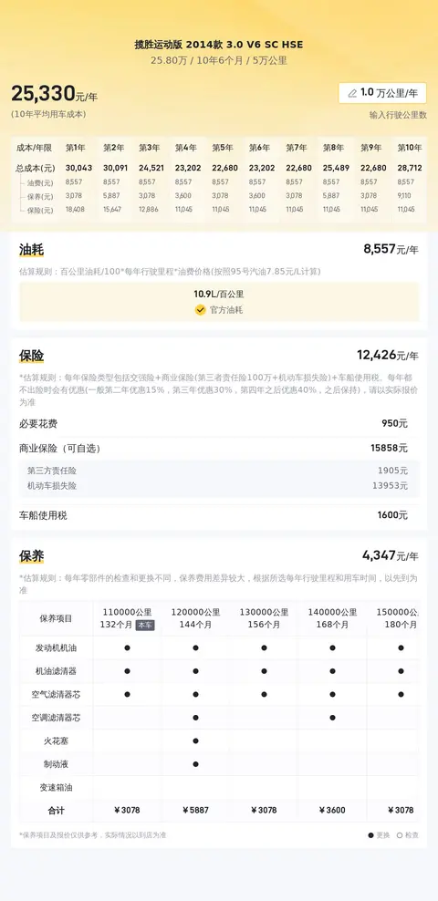 在评估车辆的整体价值时,除了购买价格之外,日常使用过程中的开销也是不容忽视的重要因素。接下来,我们将对这辆二手路虎揽胜运动版的燃油费用、保险费用以及保养费用进行详细解析,以帮助您全面掌握其真实的持有成本。