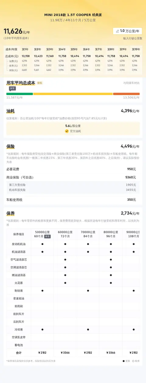 当前,这款二手MINI的市场行情价格在12.5万至15.14万元之间。然而,我们的报价仅为11.98万元,相较于市场行情低了不少,这无疑为购车者提供了一个极具性价比的选择。在用车成本方面,我们对这款车的平均用车成本进行了分析。数据显示,其6年多的平均用车成本为12186元/年,而同级车的最低10年平均用车成本为11248元/年,最高则达到14373元/年。因此,从用车成本角度来看,这款MINI处于同级车中的合理水平。值得一提的是,这款车目前的热度较高,预计30天内价格不会下降。对于潜在的购车者来说,这是一个不容错过的机会。