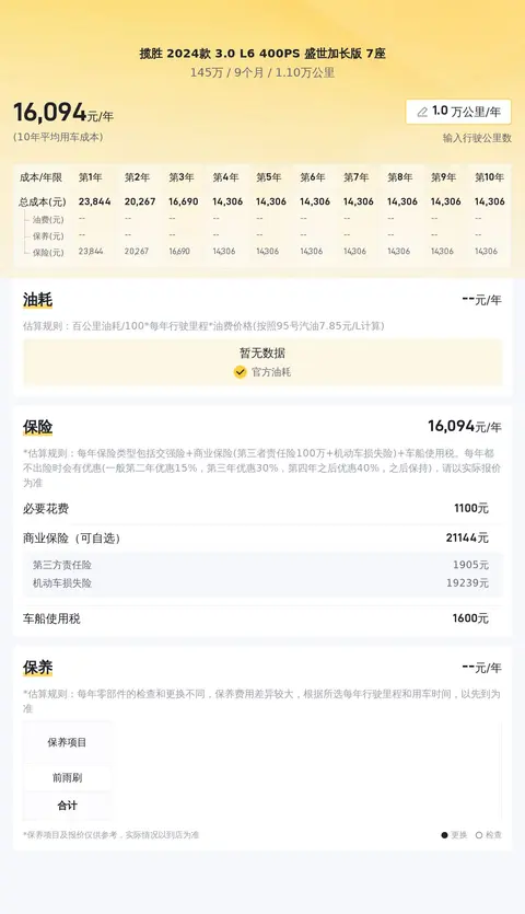 买得起车,还得养得起车。对于2024年款揽胜3.0 L6 400PS盛世加长版7座SUV来说,每年的用车成本可得好好算算。按照每年 2 万公里的行驶里程来算,百公里油耗按10升计算,每年的油费得小2万元;再算上一年商业保险+交强险+车船使用税,得个20104元;保养车是必不可少的,按照每年2次来算,再保守也得5000大洋。这么一合计,每年的用车成本得小4万5千块。这可不是个小数目,得量力而行。