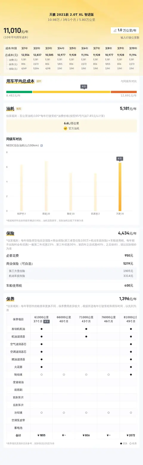 购车时不仅要考虑购车成本,也要计算日常使用开销。基于全国的保有量和近半年销量数据,我们可以估算出该车型的平均用车成本。值得注意的是,个别车主的用车成本可能会因使用方式、环境条件等因素而有所不同。