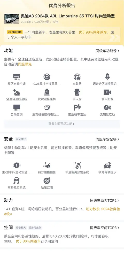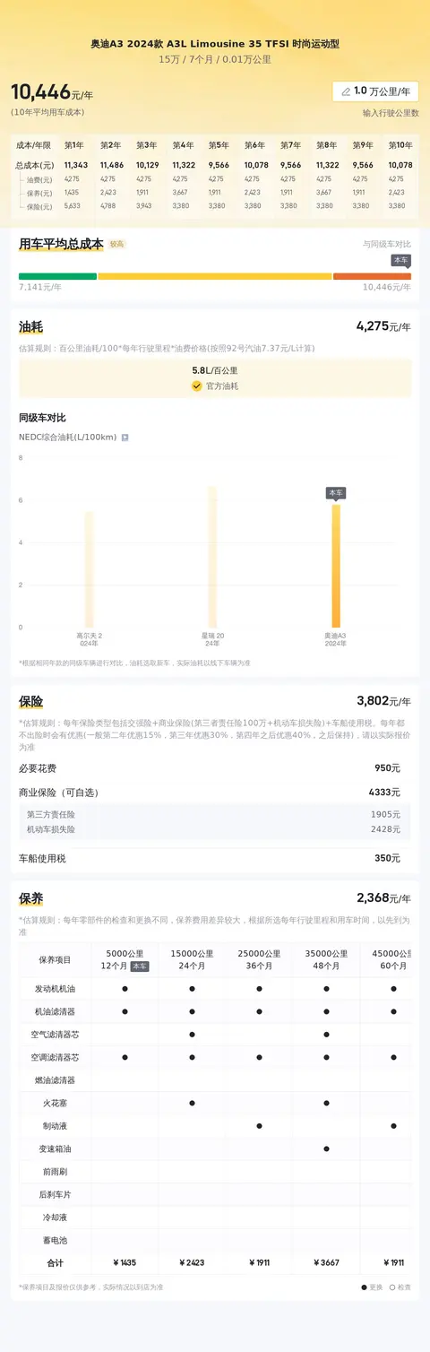 据估算,同级车的最低用车成本是4465元/年,最高是12736元/年,奥迪A3 2024款 A3L Limousine 35 TFSI 时尚运动型是10432元/年,所以用车成本较高。
