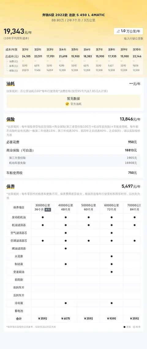 购车不仅是一次性支出,还包括后续的燃油、保养、保险等费用。我们对这款车的10年平均用车成本进行了估算,约为23007元/年。然而,请注意,实际成本可能会因个人驾驶习惯、地区差异等因素而有所不同。