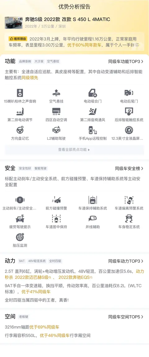 在我们看来,这款车的车况相当良好,无论是在外观还是内饰方面,都没有发现明显的瑕疵或损坏。这也从侧面反映了车主对车辆的精心维护和爱护。除了车况良好外,这款车还配备了奔驰S级特有的L2辅助驾驶功能,这为驾驶者提供了更加安全和舒适的驾驶体验。同时,作为一款豪华轿车,它在动力、悬挂以及内部配置等方面也都展现出了卓越的性能和品质。总体而言,这款车是一款集豪华、舒适、安全和高性能于一身的优质车型。