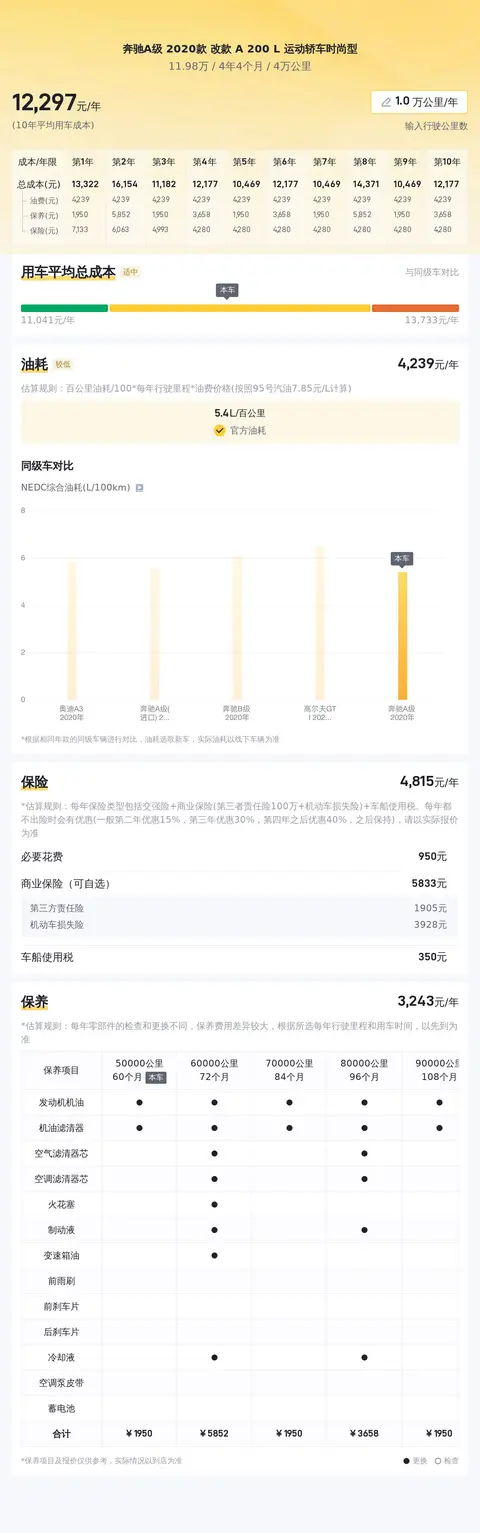 当前市场上,这款车型的二手车价格大约在13.5万元到15.9万元之间。当然,具体的售价会受到车辆状况等因素的影响。关于用车成本方面,根据估算,这辆奔驰A级的年均综合用车成本约为1.2万元。需要注意的是,实际费用支出可能会因个人使用习惯及维护情况而有所差异。