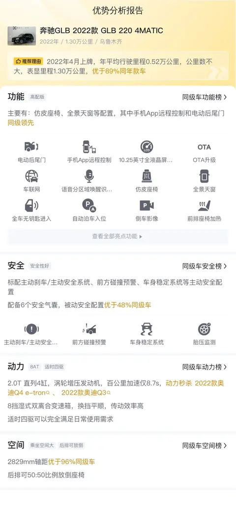 买二手车嘛,大家都想捡个漏。这款二手奔驰GLB 2022款 GLB 220 4MATIC的报价为23.9万元,在二手车市场上,这款车的行情大致在19万至22万左右。当然,车况不同价格也会有差异,这话得搁这儿。