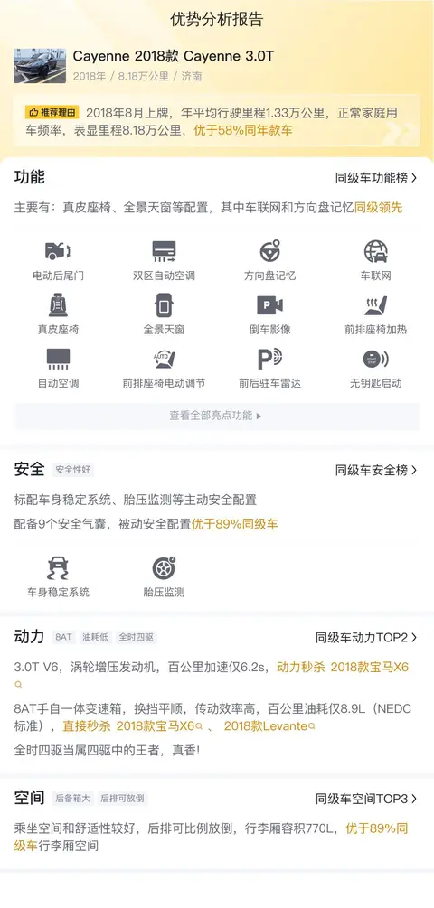 保时捷Cayenne(图片|配置|询价)自2002年在日内瓦车展首现身以来,成为了豪华SUV领域里的硬核选手。它不仅承载了保时捷的赛车精髓,更通过其宽裕的内部空间、强悍的动力性和高端装备,实现了日常功能性与舒适性的完美融合。今天要说的这辆保时捷Cayenne 2018款 Cayenne 3.0T是一辆中大型SUV,车身结构为4门5座SUV,搭载了3.0T V6机械增压发动机和8挡手自一体变速箱,全时四驱系统使得它具备出色的越野性能,同时兼顾了城市驾驶的舒适性。车身尺寸为4918x1983x1696mm,轴距为2895mm,为乘客提供了宽敞的空间。该车于2018年8月上牌,行驶里程为8.1万公里,目前报价42.88万元。