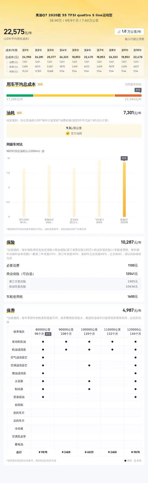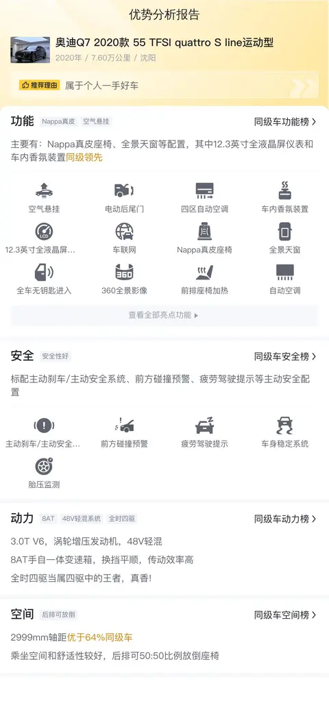 这辆2020款奥迪Q7 55 TFSI quattro S line运动型,上牌地车源地均为辽宁沈阳,上牌时间为2020年1月,表显里程7.6万公里,新车指导价78.88万,今天文中介绍的车况综合了懂车帝对其质量和服务保障的分析,希望能助您更全面地认识和判断车况。那么接下来,就让我们一起从各方面详细了解下这款车吧!