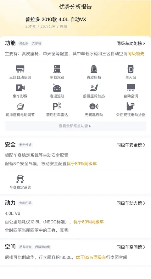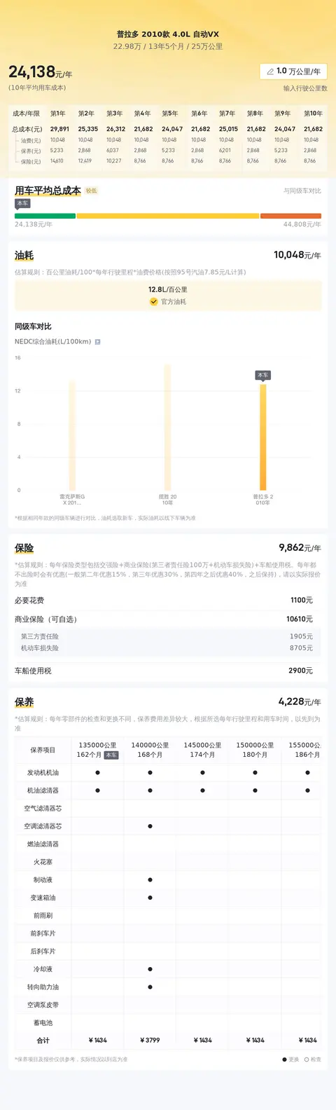 据估算,普拉多 2010款 4.0L 自动VX的用车成本是23571元/年,同级车的最低是17078元/年,最高是34749元/年,所以用车成本不算低。