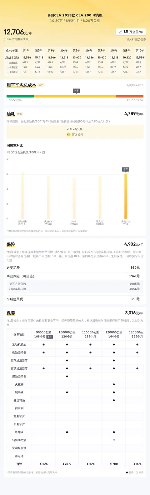 在用车成本方面,这款奔驰CLA 2018款 CLA 200 时尚型二手车的百公里油耗为6.1升。按照每年行驶2万公里计算,其每年的油费约为9664元。这一数字相较于同级别车型而言,属于较为合理的水平。然而,由于二手车的保养费用通常较高,预计每年的保养费用约为4685元。此外,保险费用也是用车成本中不可忽视的一部分。按照每年5664元计算,其每年的用车成本总计约为20013元。这一数字相较于新车而言,并未有明显的降低。但考虑到二手车的折旧速度通常较慢,从长期来看,购买二手车仍具有较高的性价比。