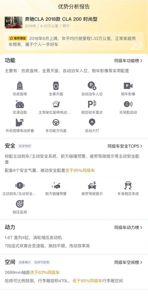 这款奔驰CLA 2018款 CLA 200 时尚型二手车具有诸多优点。首先,其里程数较低,这意味着车辆的磨损程度较小,使用寿命也相对较长。其次,该车采用了高级材质打造,无论是触感还是乘坐舒适度都达到了较高水平。同时,车内还配备了多项舒适配置,为乘客提供了更为舒适的乘坐环境。此外,该车的动力性能和驾乘感受也都表现出色。然而,这款二手车也存在一些劣势。首先,其市场价格相对较高,不太适合预算有限的消费者。其次,该车的保养费用也较高,可能会增加用车成本。最后,后排空间较小,可能不太适合家庭用车。