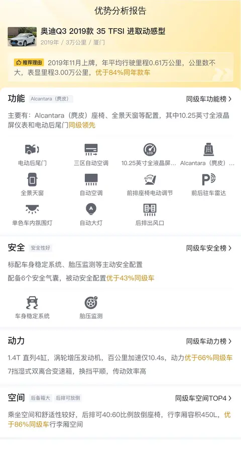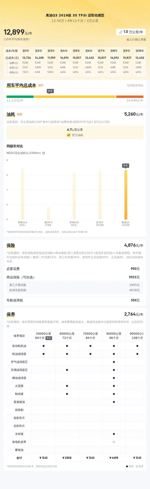 据估算,同级车的最低用车成本是11598元/年,最高是17766元/年,奥迪Q3 2019款 35 TFSI 进取动感型是13455元/年,用车成本不算低。