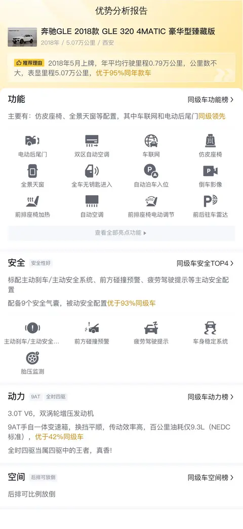这辆奔驰GLE 2018款 GLE 320 4MATIC 豪华型臻藏版是一款中大型SUV,车身颜色为白色,上牌地为陕西西安,上牌日期为2018年5月,表显里程为5.07万公里,新车指导价为79.38万,现售价为32.3万元,过户次数为1次。