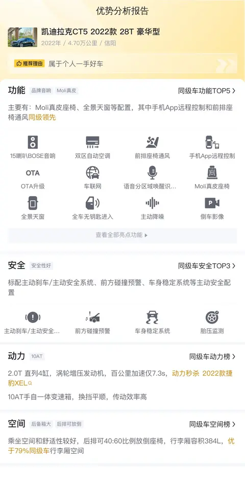 据估算,同级车的用车成本最低是6145元/年,最高是12746元/年,凯迪拉克CT5 2022款 28T 豪华型的是12746元/年,所以用车成本偏高。