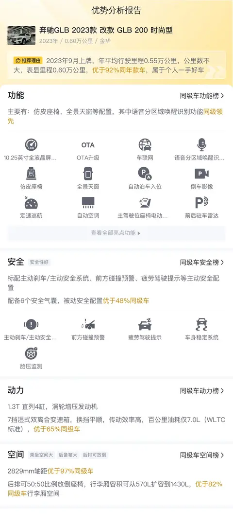 优势:准新车,基本就是新车状态,所以车况很好,配置丰富,自动泊车是个不错的亮点,空间在同级别中也属于比较宽敞的,而且奔驰的蓝瑟动力也算是可圈可点,油耗不高,用车成本还行。