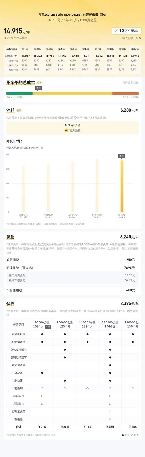 在考虑购买二手车时,除了购车成本外,还需要合理预期日常使用和保养的成本。对于宝马X3这样的豪华车型而言,这些费用可能会相对较高。以一年 2 万公里的行驶里程来计算,预计平均油耗为百公里10升,那么燃油费用约为1680元一个月。保险方面,每年的费用大约在6700元左右。保养方面,由于宝马X3每行驶5000公里就需要进行一次保养,预计每次保养费用在3000元左右。此外,还需预留一些预算用于洗车、打蜡等其他杂项开支,以及可能出现的维修费用。基于上述各项开支的估算,这辆二手宝马X3的年均综合用车成本大约在每年1.5万元左右。需要注意的是,实际费用可能会根据个人使用习惯、地区差异以及车辆具体状况等因素有所变动。